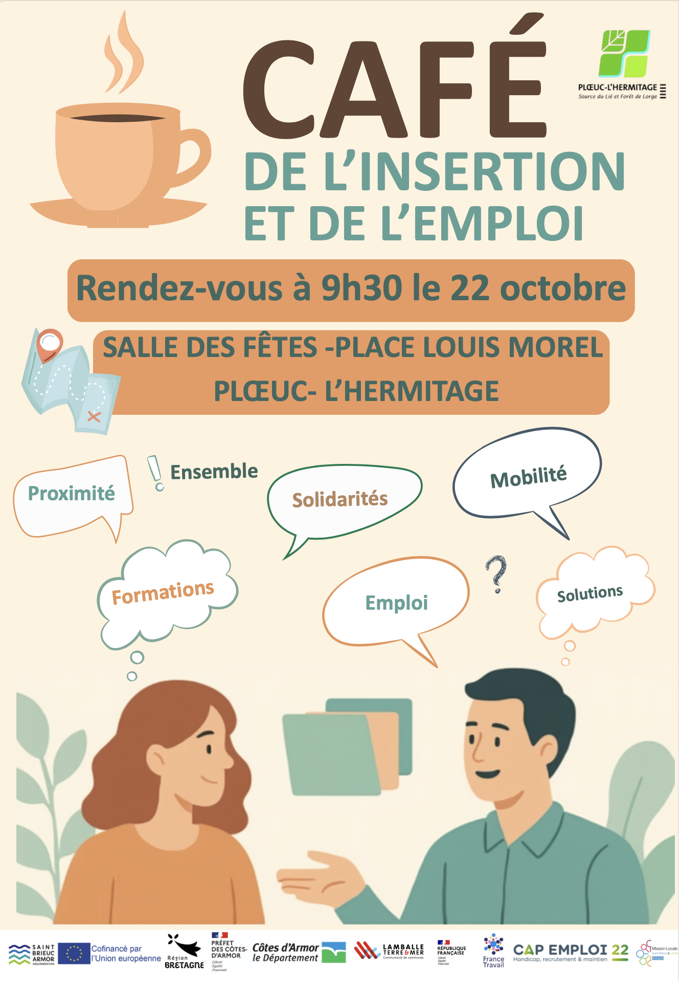 Dans le cadre du Réseau pour l'Emploi, Saint-Brieuc Armor-Agglomération organise avec ses partenaires de l'emploi France Travail , la Mission Locale Saint Brieuc & Lamballe , la Région Bretagne , la DREETS, Côtes d'Armor le Département , CAP EMPLOI et @LAMBALLE TERRE ET MER un Café de l'Insertion et de l'Emploi.