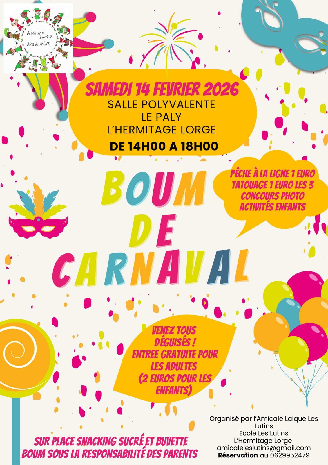 L'Amicale Laïque Les Lutins organise un carnaval le samedi 14 février de 14h à 18h à la salle polyvalente.Adultes : gratuit.Enfants : 2€.Snacking et buvette.Réservation au 06 29 95 24 79.