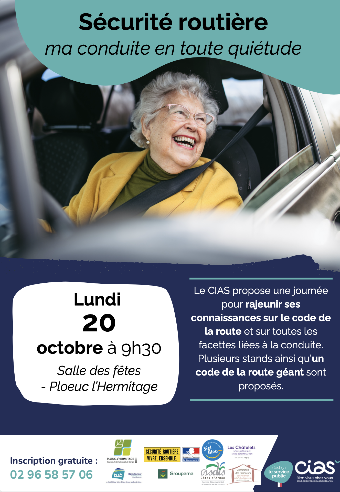 Le CIAS de Saint-Brieuc Armor Agglomération et le CCAS organisent une journée sur le thème de la sécurité routière le lundi 20 octobre à partir de 9h30 à la salle des fêtes de Plœuc-L'Hermitage.