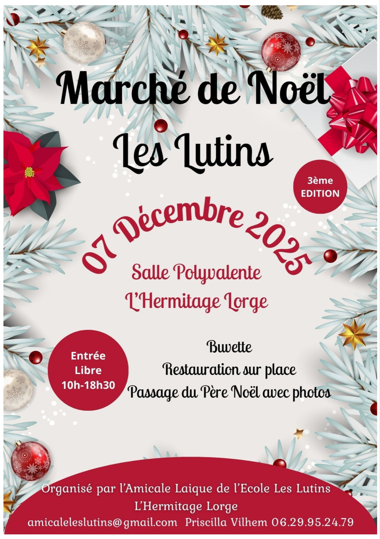 L'Amicale Laïque de l'École Les Lutins organise son Marché de Noël le dimanche 7 décembre de 10h à 18h30 à la salle polyvalente de L'Hermitage Lorge.